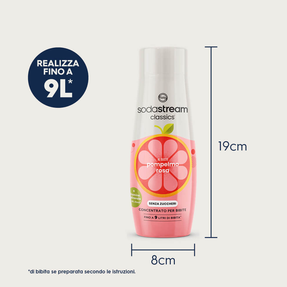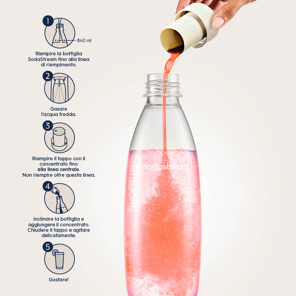 La quantità di concentrato da utilizzare dipende dall'intensità di sapore che vuoi dare alle tue bevande. Noi consigliamo un tappo di concentrato per ogni litro d'acqua gasata.
