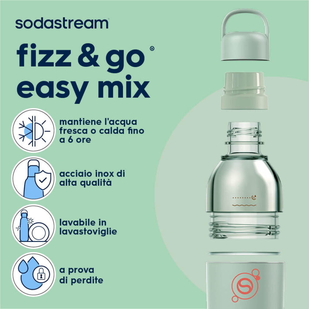 Goditi bevande fresche e frizzanti ovunque ti trovi con la borraccia termica Sodastream fizz&go Easy Mix colore menta. Realizzata in acciaio inox 18/8 e plastica senza BPA, la sua doppia parete interna mantiene la freschezza e la frizzantezza delle tue bibite fino a 6 ore.