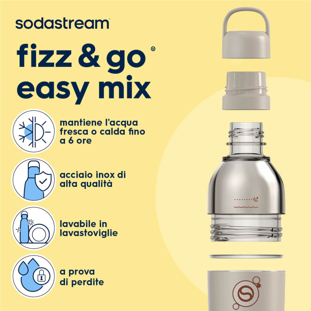 Goditi bevande fresche e frizzanti ovunque ti trovi con la borraccia termica Sodastream fizz&go Easy Mix colore menta. Realizzata in acciaio inox 18/8 e plastica senza BPA, la sua doppia parete interna mantiene la freschezza e la frizzantezza delle tue bibite fino a 6 ore.