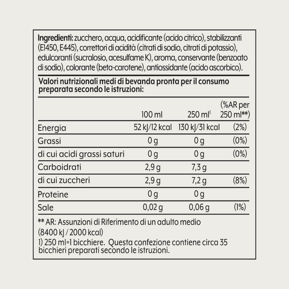 Con una confezione da 440 ml di prodotto si possono preparare 9L di bevanda.