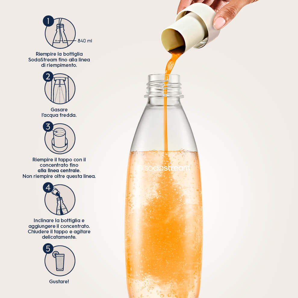 La quantità di concentrato da utilizzare dipende dall'intensità di sapore che vuoi dare alle tue bevande. Noi consigliamo un tappo di concentrato per ogni litro d'acqua gasata.