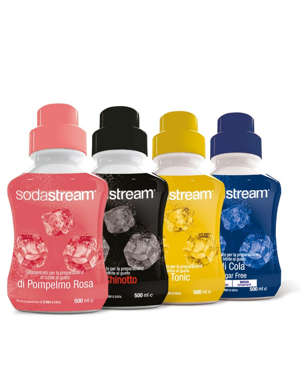 Concentrato per la preparazione di bevande dissetanti gassate ai gusti Pompelmo Rosa, Chinotto, Tonica e Cola Sugar Free.