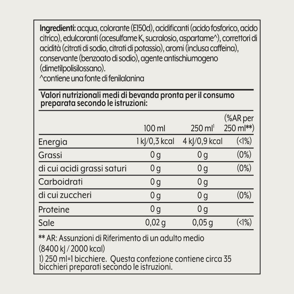 Concentrato per la preparazione di bevande dissetanti gassate al gusto Pepsi Zero.