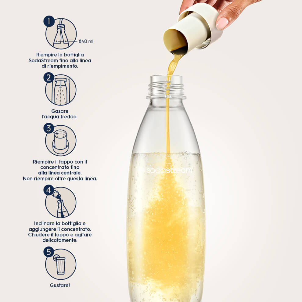 La quantità di concentrato da utilizzare dipende dall'intensità di sapore che vuoi dare alle tue bevande. Noi consigliamo un tappo di concentrato per ogni litro d'acqua gasata.