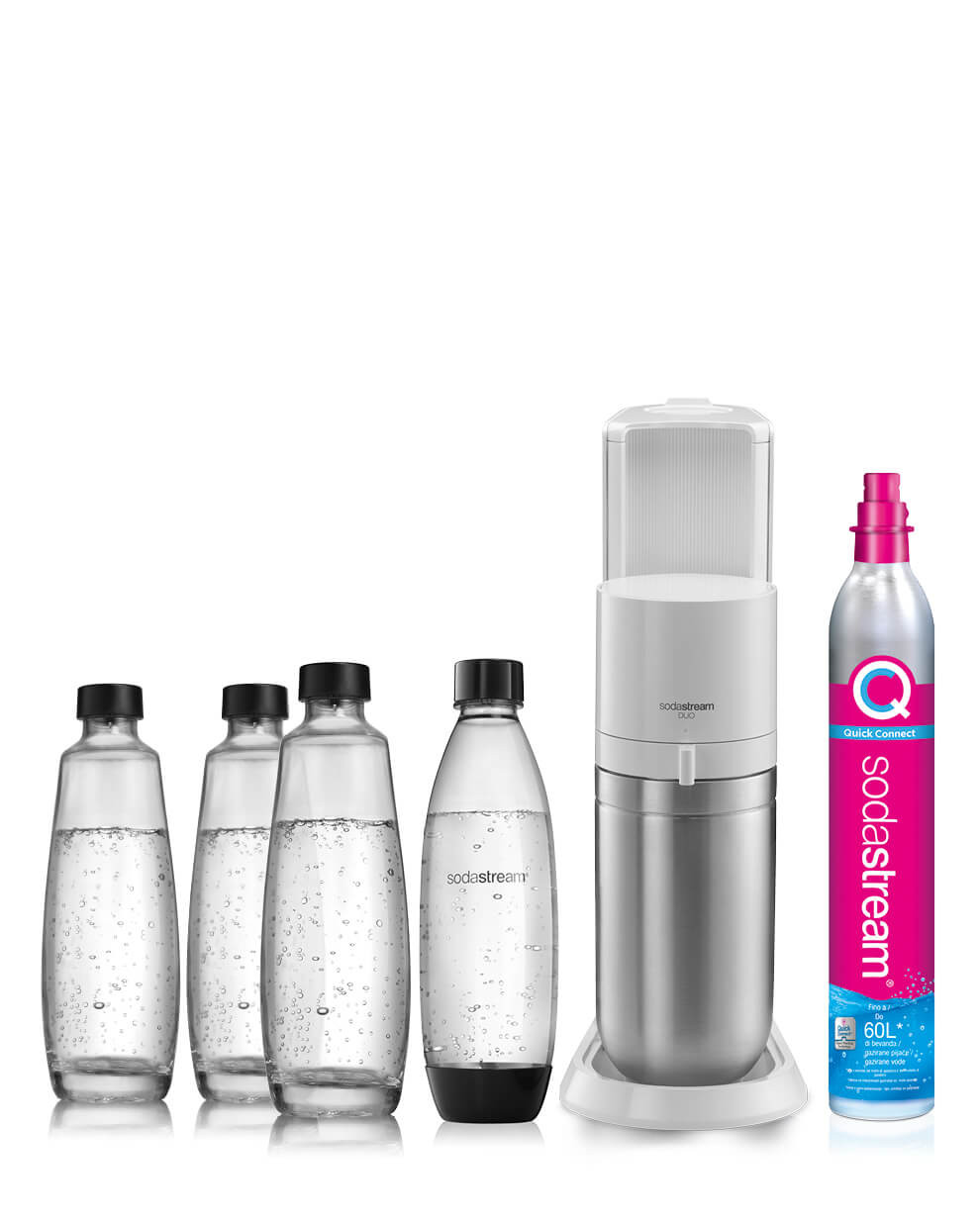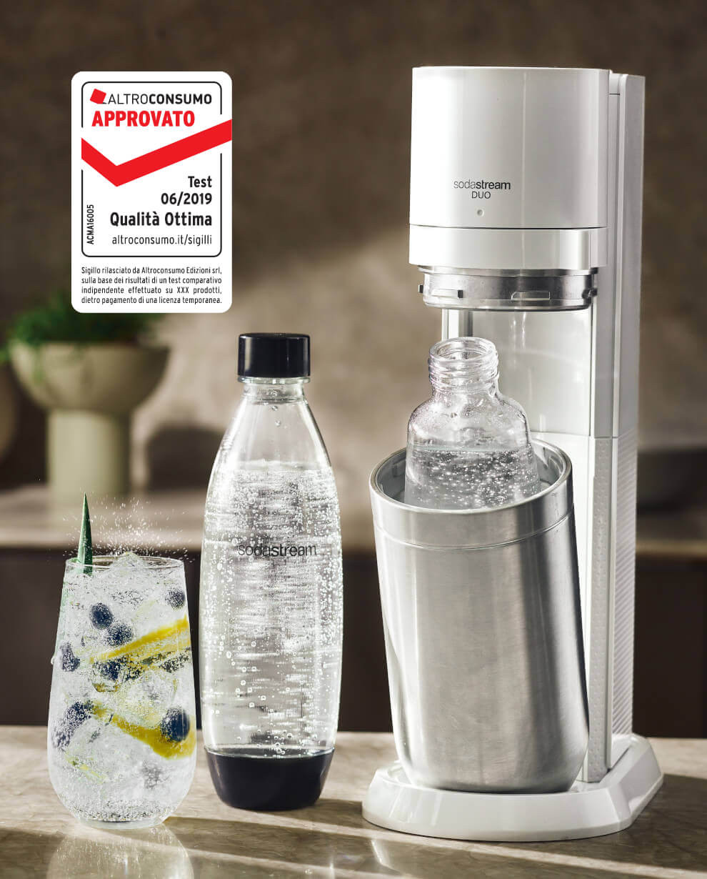 Sodastream Duo è il gasatore SodaStream con il nuovo attacco rapido del cilindro gas e doppia bottiglia in vetro e PET lavabile in lavastoviglie. Grazie al design più compatto e ancor più elegante si adatta perfettamente ad ogni cucina