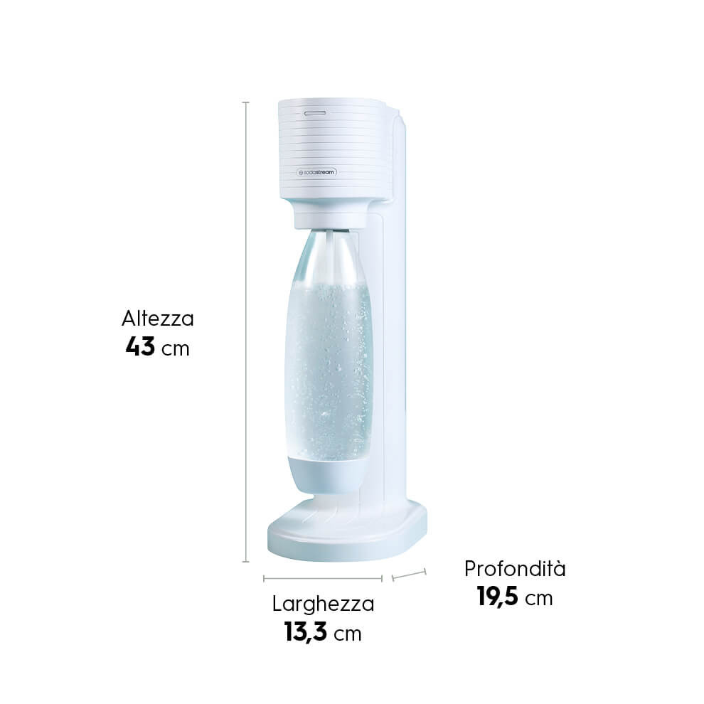 SodaStream Gaia è il gasatore SodaStream con il nuovo cilindro CQC a incastro rapido. Grazie al design più compatto si adatta perfettamente ad ogni cucina. Dotato di bottiglia in PET lavabile in lavastoviglie con aggancio ad avvitamento.