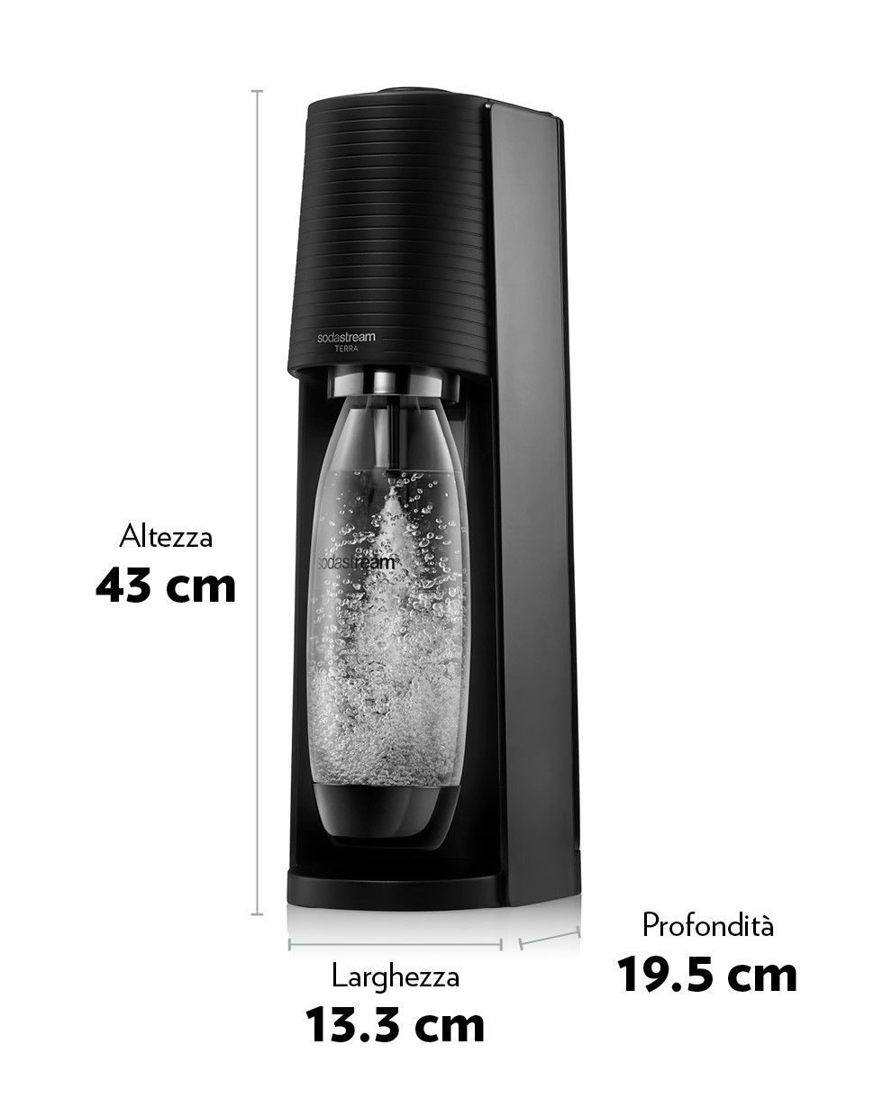 Sodastream Terra Nero è il gasatore SodaStream con il nuovo cilindro CQC a incastro rapido e il sistema Snap-Lock per un facile inserimento della bottiglia PET lavabile in lavastoviglie. Grazie al design più compatto e ancor più elegante si adatta perfettamente ad ogni cucina.