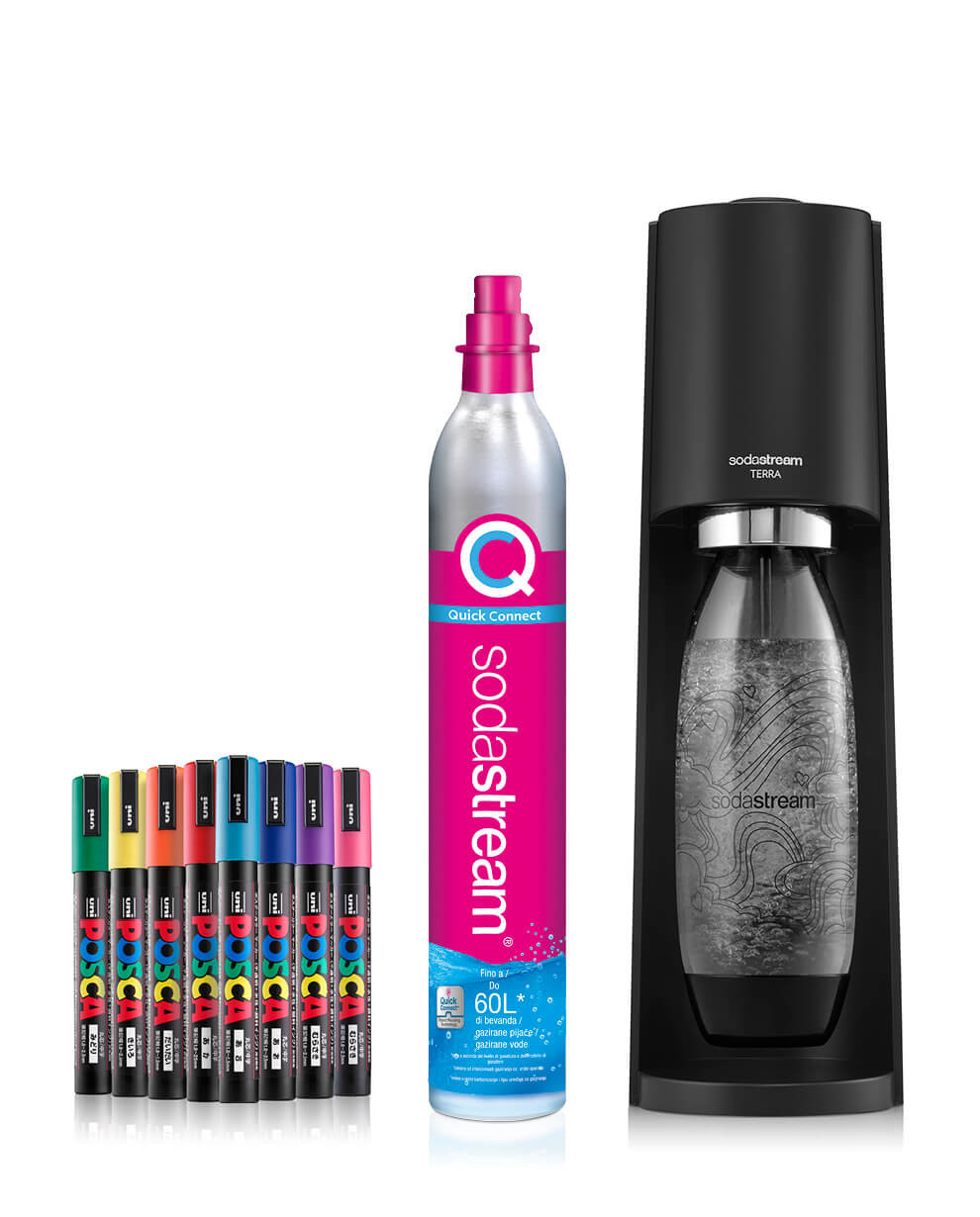 Terra Limited Edition è il gasatore Terra personalizzabile grazie al set di pennarelli Uniposca compresi nella confezione e all'elegante tinta nero opaco del gasatore.