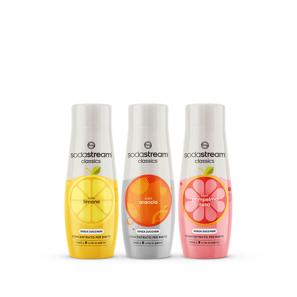 Pack di 3 concentrati al gusto agrumi per la preparazione di bevande dissetanti gassate: limone zero, arancia zero e pompelmo rosa zero.