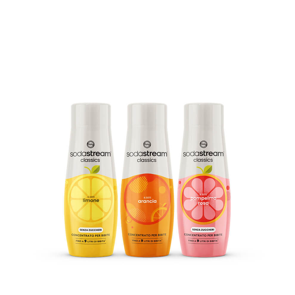 Pack di 3 concentrati al gusto agrumi per la preparazione di bevande dissetanti gassate: limone zero, arancia e pompelmo rosa zero.