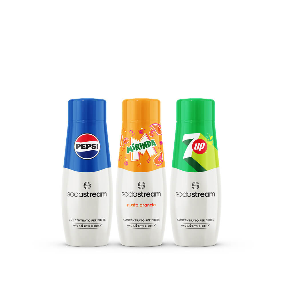 Pack di 3 concentrati per la preparazione di bevande dissetanti gassate al gusto Pepsi, Seven Up e Mirinda.