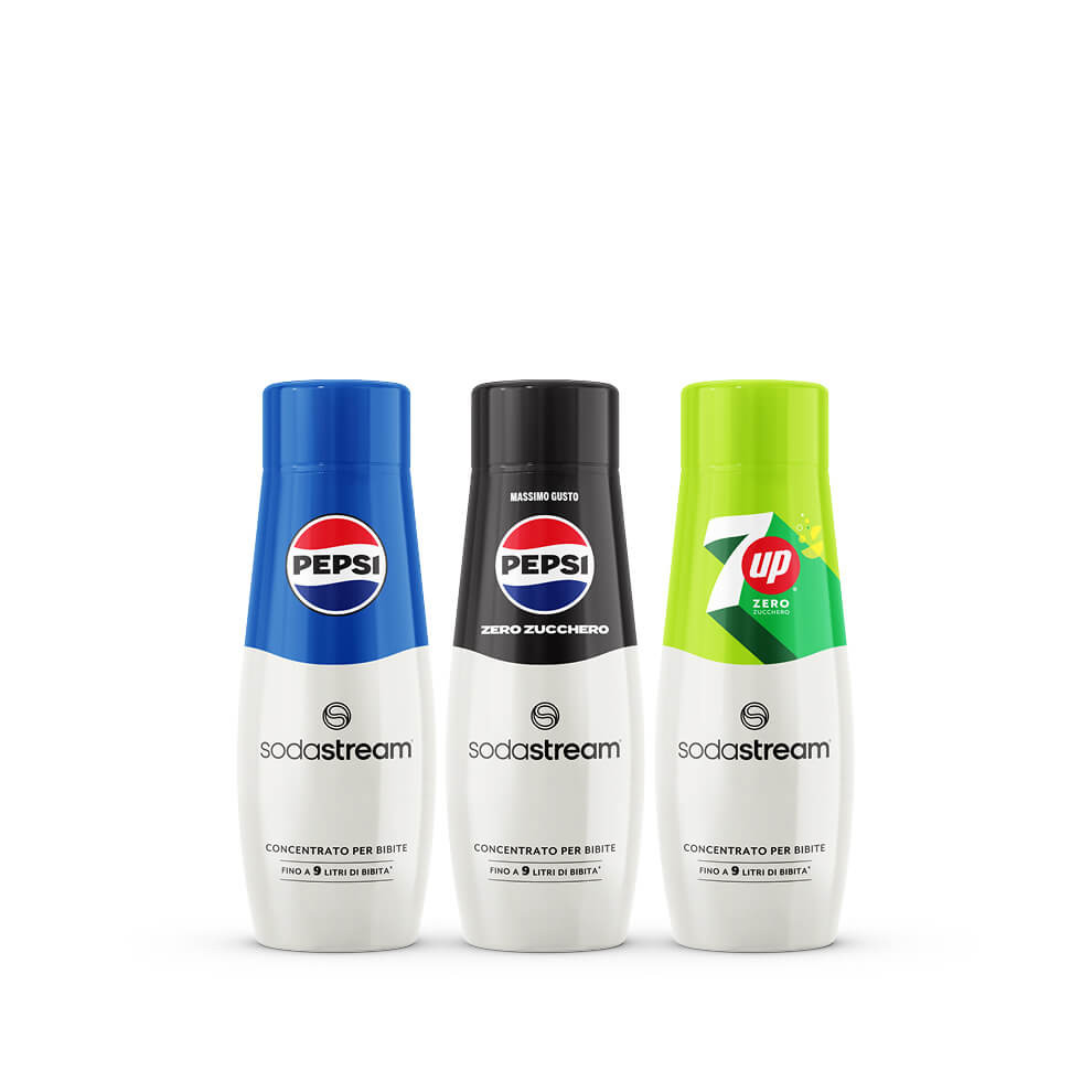 Pack di 3 concentrati per la preparazione di bevande dissetanti gassate al gusto Pepsi, Pepsi Zero e Seven Up Zero.