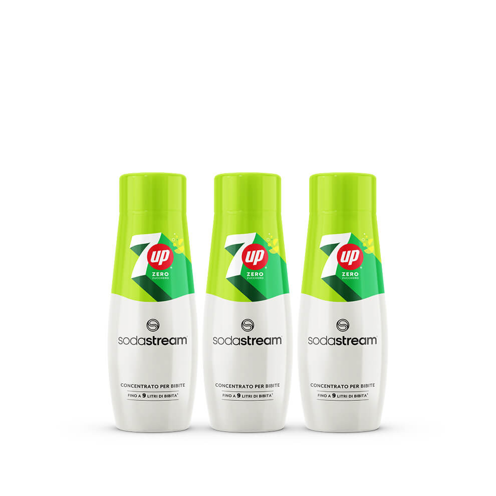 Pack di 3 concentrati per la preparazione di bevande dissetanti gassate al gusto Seven Up Zero.